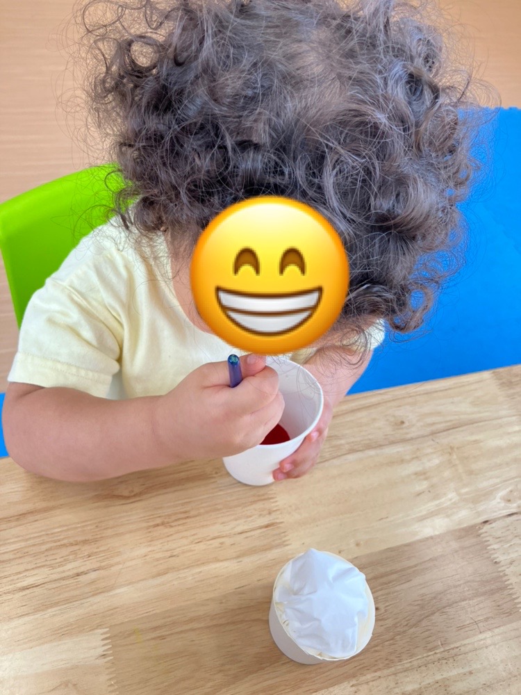 紙コップを半分に切り、ティッシュをぎゅうぎゅうに詰めたあとは、絵の具を使ってシロップに見立てた色水を作り、詰めたティッシュに色をつけて完成です✨
