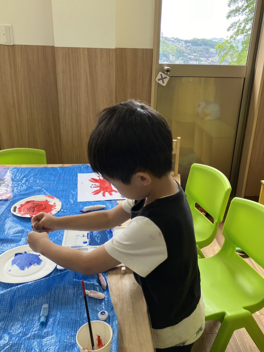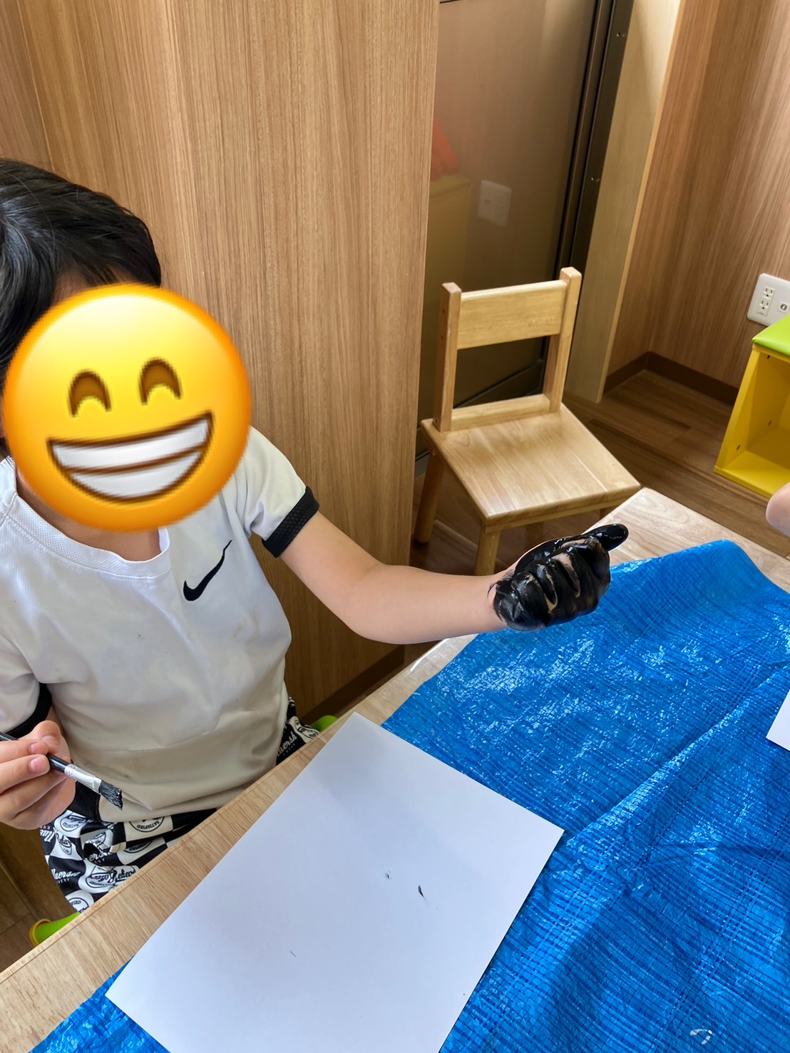 手のひらに絵の具を塗って「きもちいい~」と言いながら楽しんでいましたよ😊