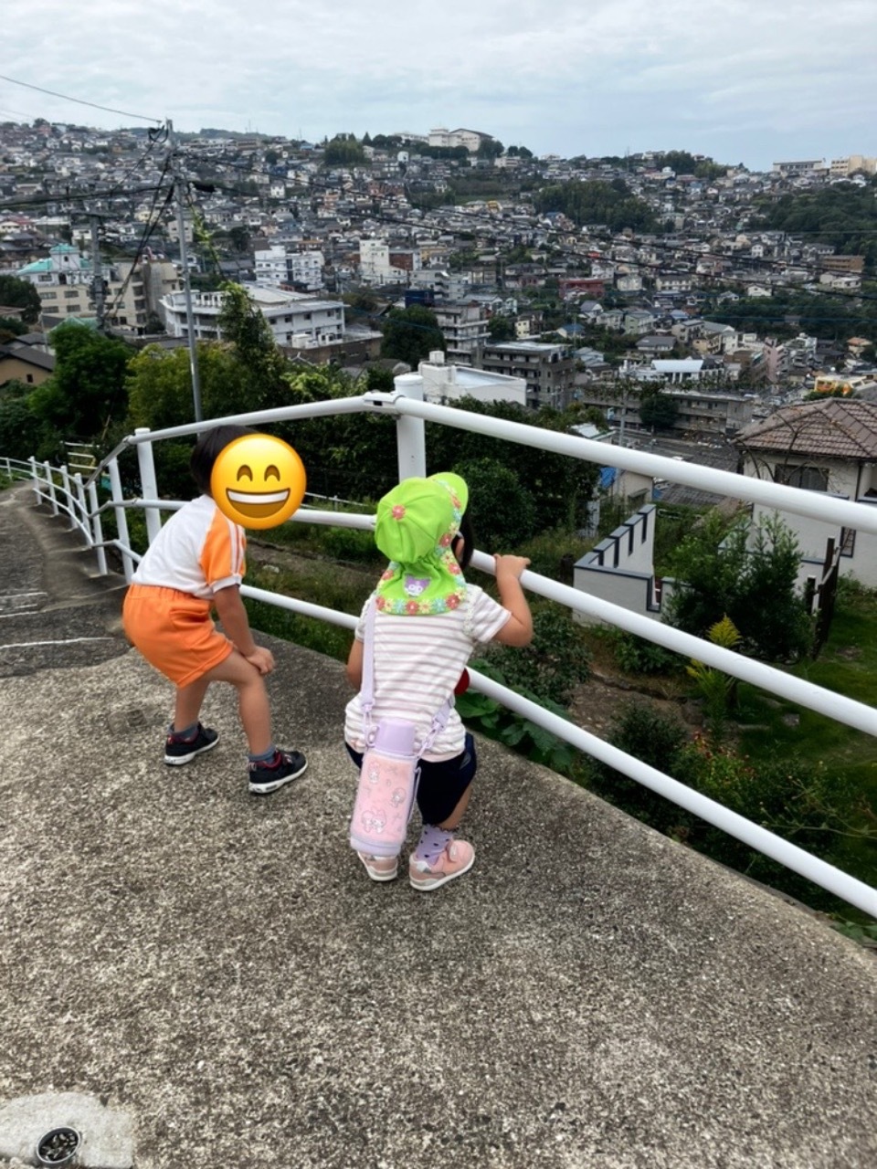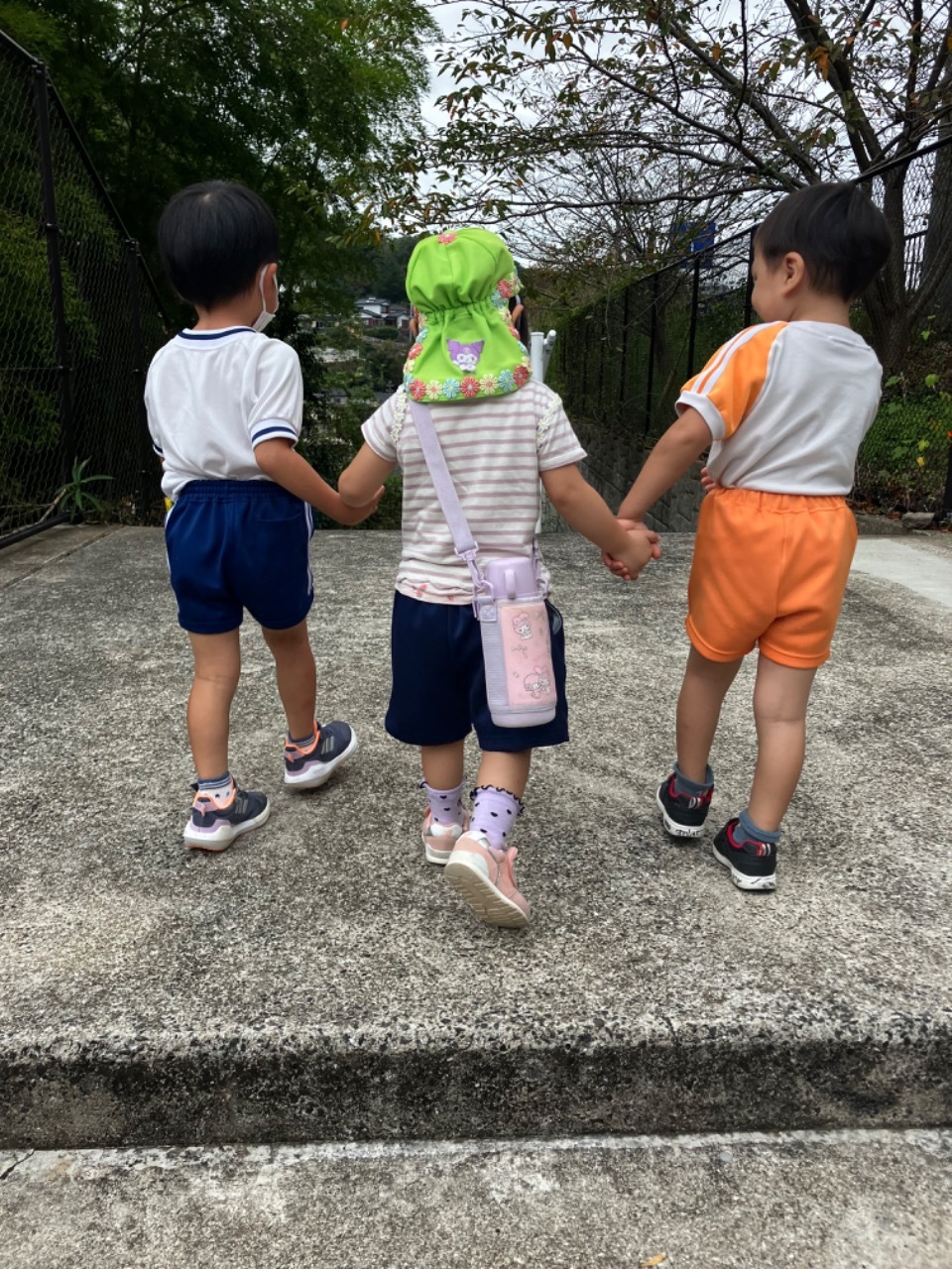 お友達と仲良く手を繋いで階段を歩きながら