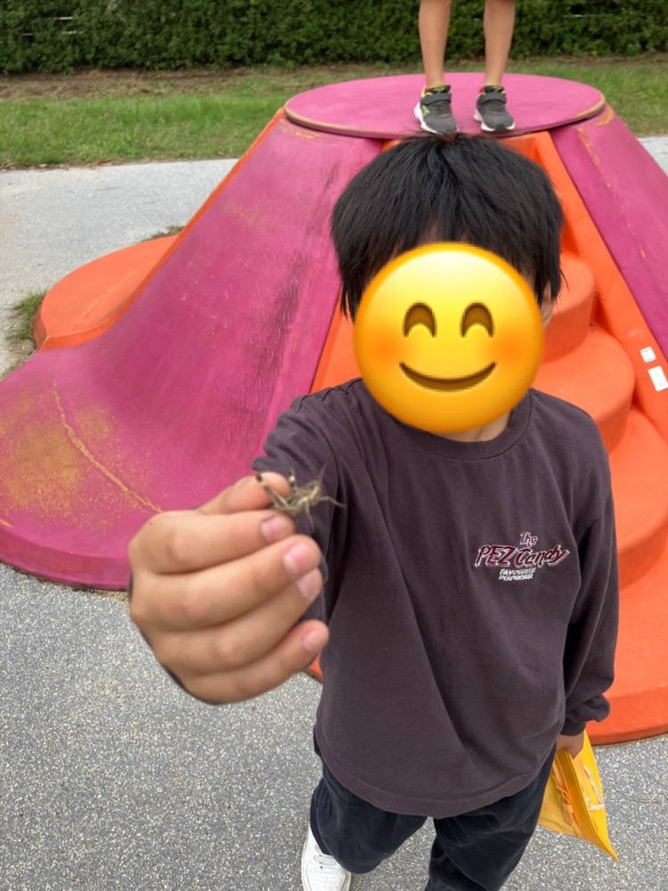 イナゴを捕まえて「将来の食糧だよ✨」と見せにきてくれるお友達😮