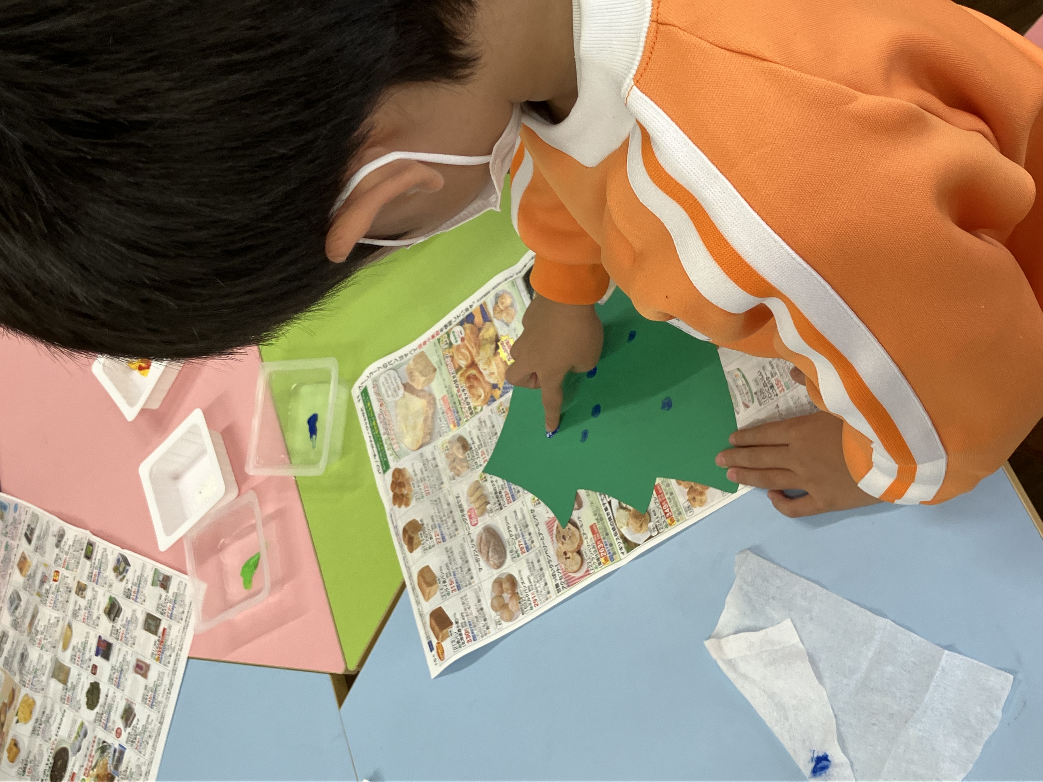もみの木の形の画用紙に指で絵の具をチョンチョン…