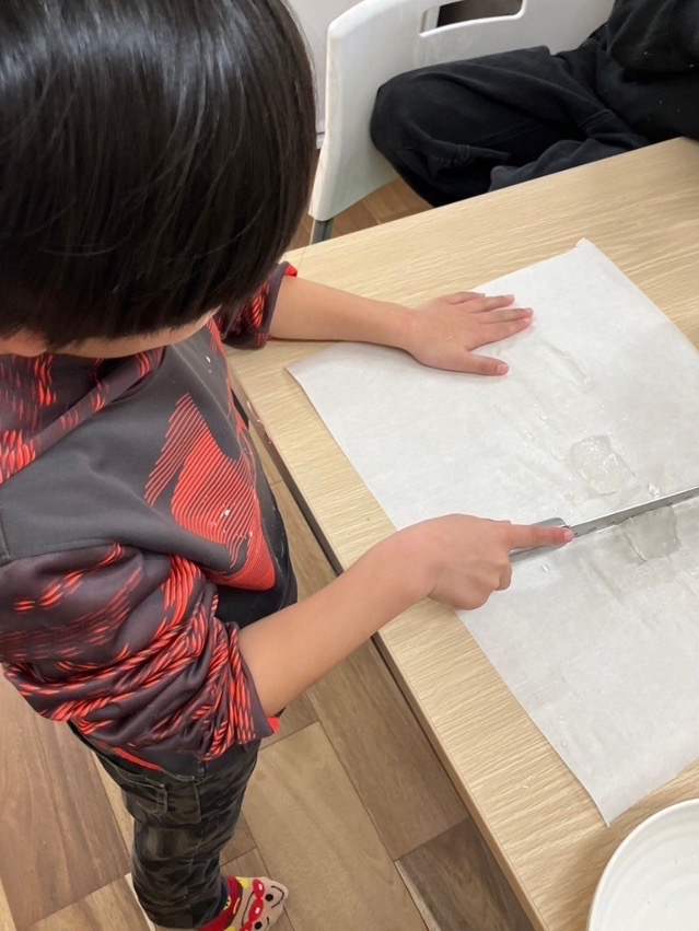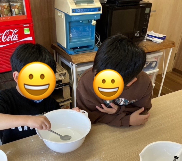 初めてのわらび餅作りで、はじめはサラサラだった液体が熱を加えるとモチモチになったことに驚き、 「すごーい!!」「おもしろいね」などの声が聞かれましたよ😊