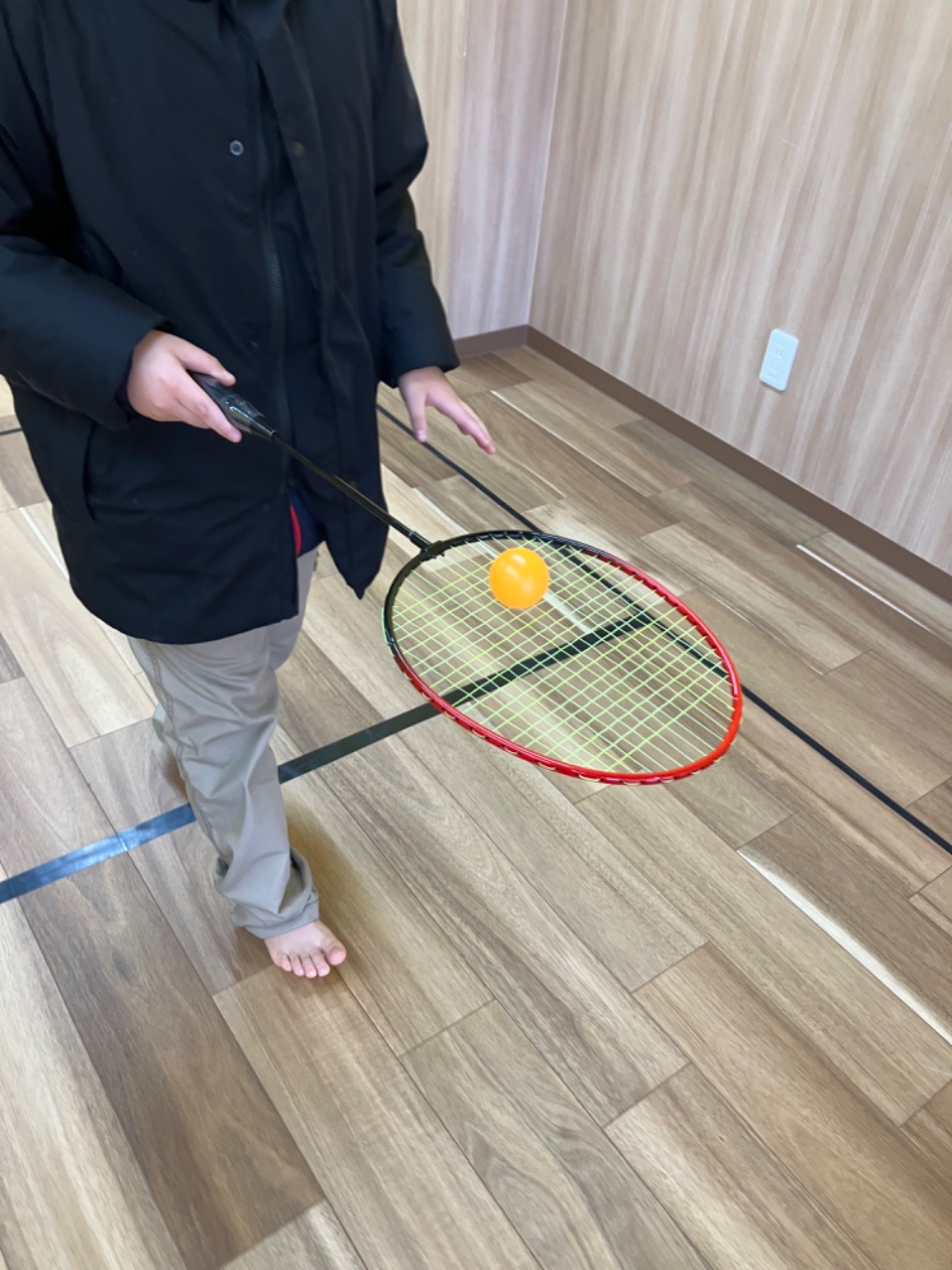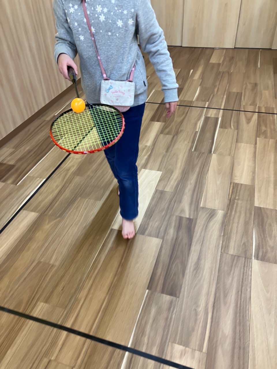 バドミントンラケットにピンポン球をのせて、バランスを保って、