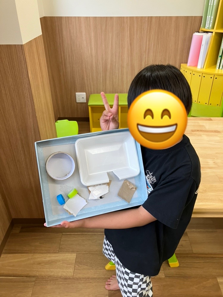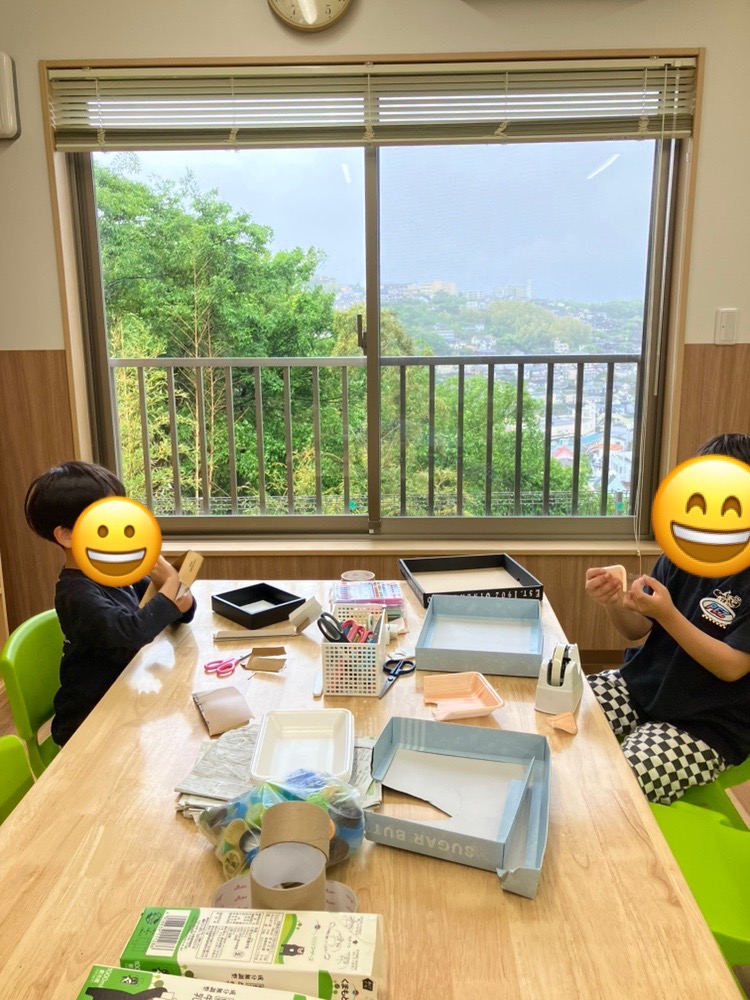 本日1.2年生は、雨天のため室内で廃材遊びを行いました!
