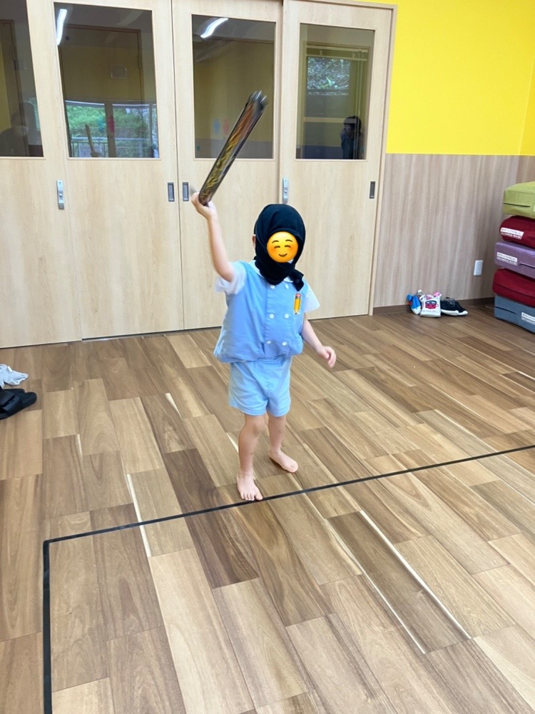 この3つの動きに挑戦!ニンニンポーズをしながら、忍者になりきって楽しみました☺