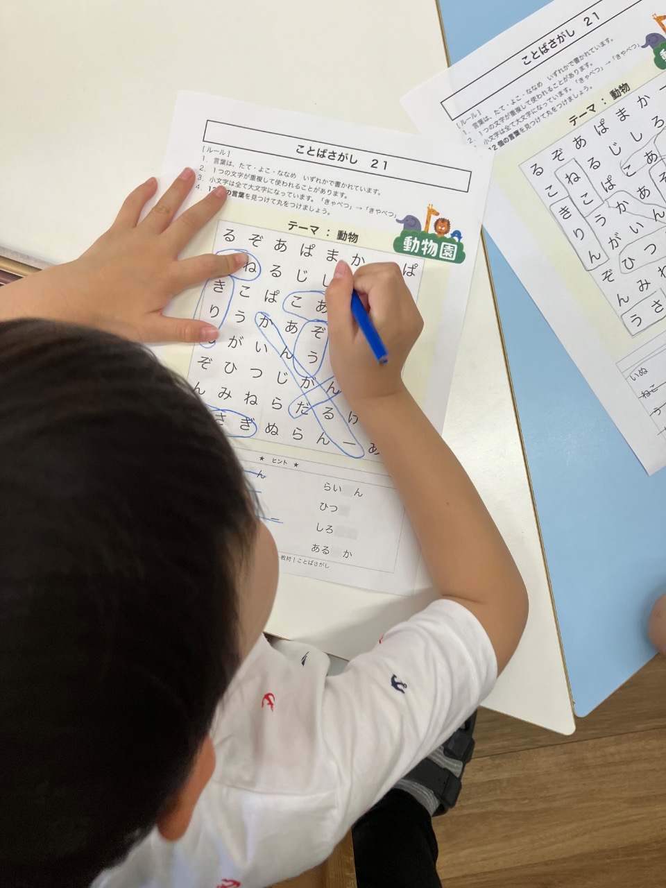 1年生のお友達は、「集中力と注意力を高める」ことをねらいとして平仮名の表から、テーマに沿った文字を見つける『言葉探し』のプリントにチャレンジしてみました✎✨