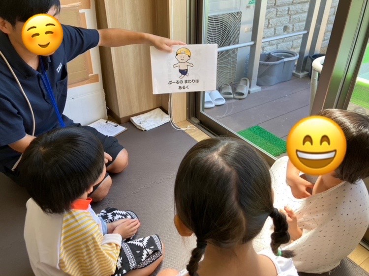 プールで遊ぶ時のお約束を確認し、準備運動をしてからゆっくりプールの中へ♪